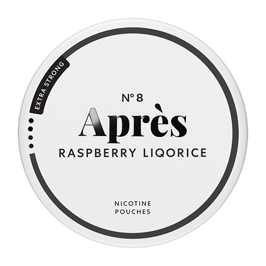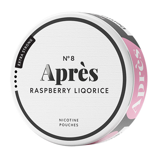 No.8 Après Raspberry Liqorice Extra Strong är ett snus av typen Vitt Snus, eller nikotinpåsar och all white som sorten även kallas, en prilla helt utan tobak fast med nikotin. Prillan har formatet Slim som är en diskret mindre prilla vilken har en bra passform under läppen. Prillorna är smaksatta med blandning av hallon och lakritspulver i en kombination av ljust och mörkt, mjukt och strävt. Varje prilla ger en långvarig smakupplevelse. Snuset har en hållbarhet på ca 12 månader.
