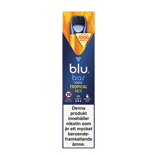 Vapen Blu Bar 1000 Tropical mix 20mg kommer från den kända snustillverkaren Skruf Snus och har en unik kombination av tropiska frukter. Denna engångsvape eller engångs e-cigg, som sorten även kallas, är bekväm och lätt att använda. Enheten är i fickstorlek och ger ca 1000 bloss per enhet, baserat på genomsnittlig användningsdata med en sekunds bloss.