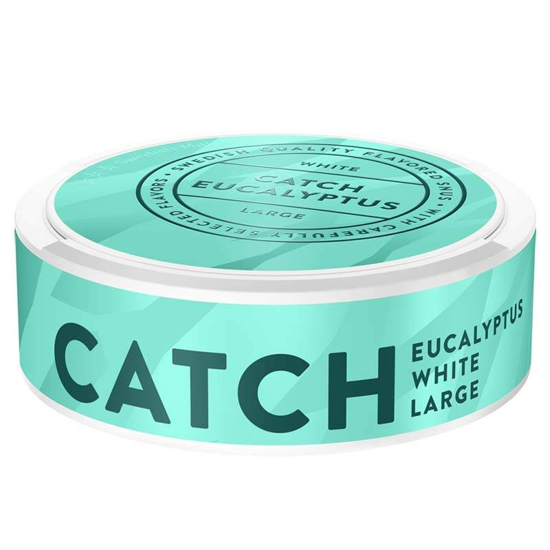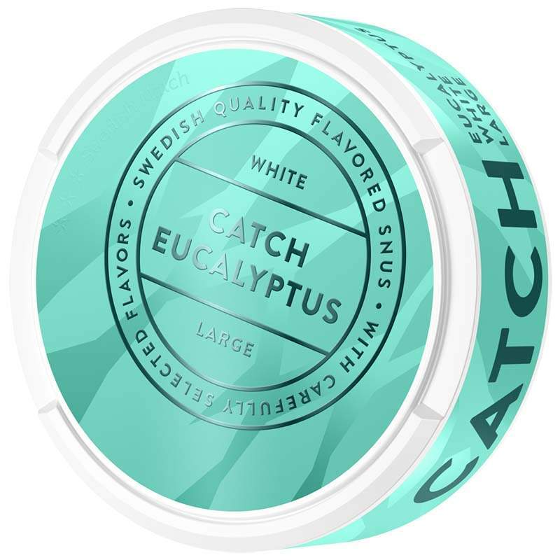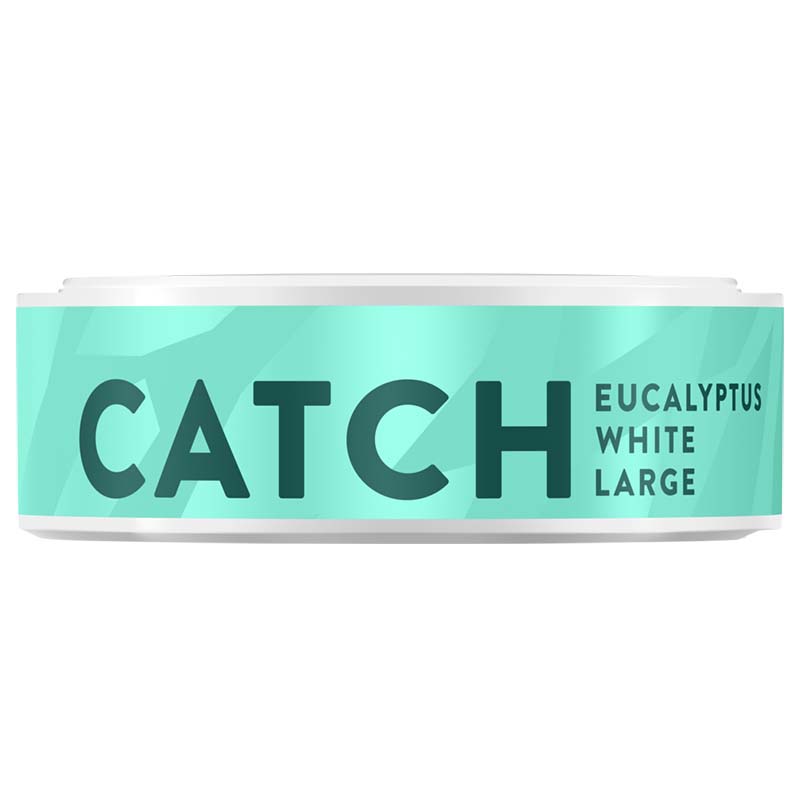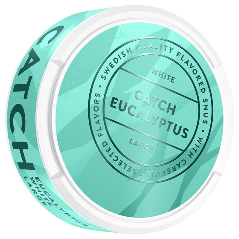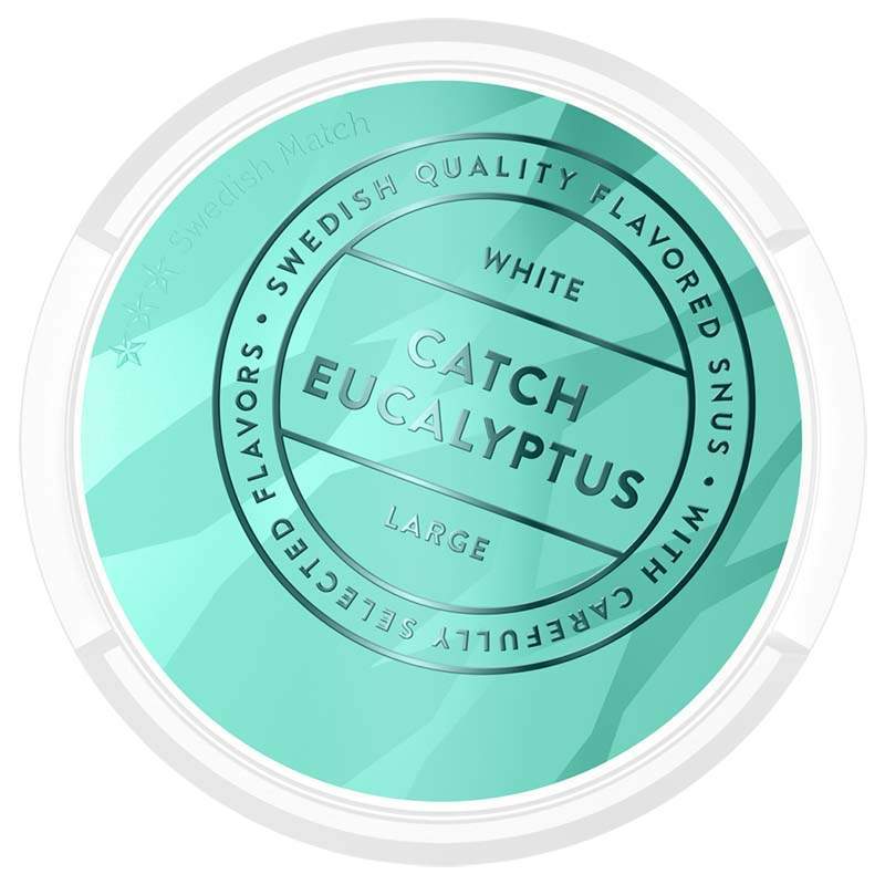 Catch Eucalyptus White har smak av eukalyptus, mint och mynta. Prillan är av typen White Portionssnus från tillverkaren Swedish Match och deras varumärke Catch. Formatet på prillorna är Large och deras hållbarhet är ca 4 månader. Fukthalten på snuset är 53%.