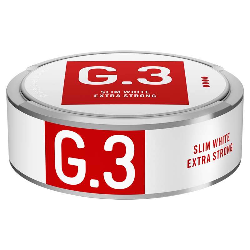 G.3 Slim White Extra Strong är ett extra starkt snus från tillverkaren Swedish Match och tillhör produktgruppen White Portionssnus. Prillorna har en kraftig och kryddig tobakskaraktär med inslag av bergamott och gröna örter, samt aningen te och hö. Formatet på prillorna är Slim vilket ger dig en långsmal prilla som är torr på ytan med fuktigt innehåll för låg rinnighet och en lång smakrelease. Fukthalten på snuset är 47% och dess hållbarhet är ca 4 månader.