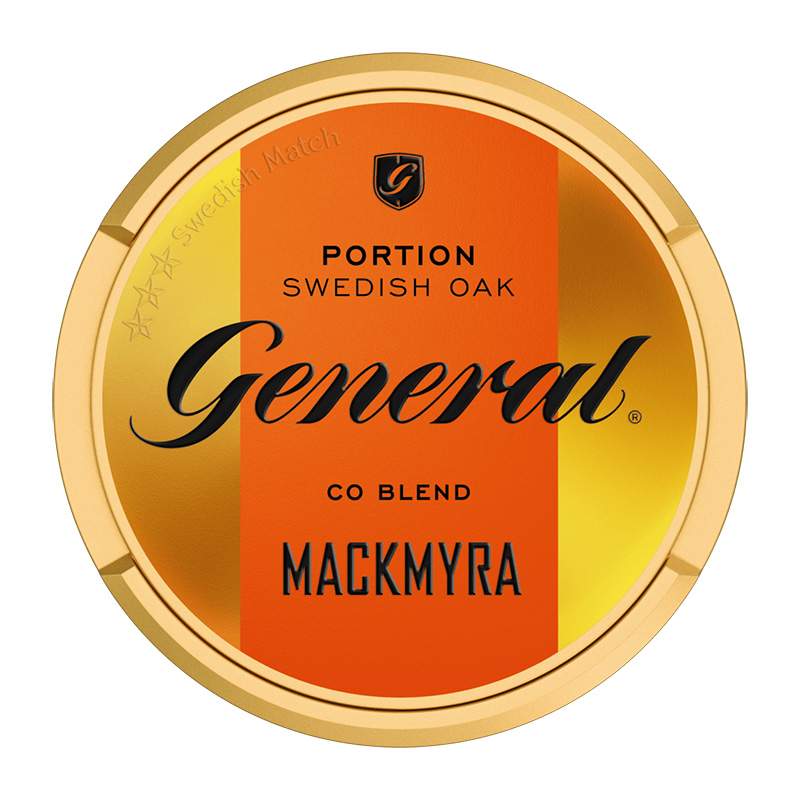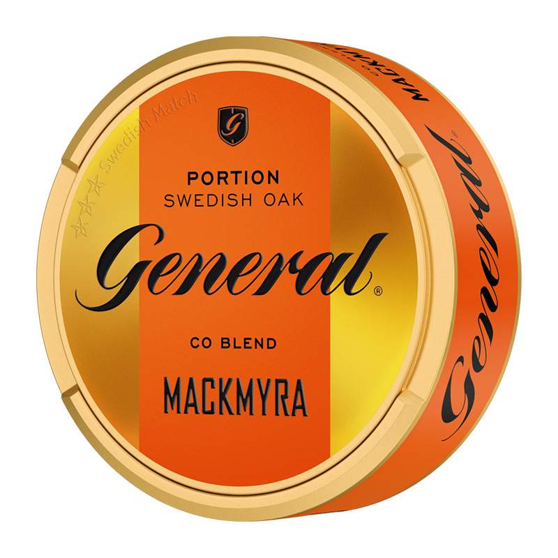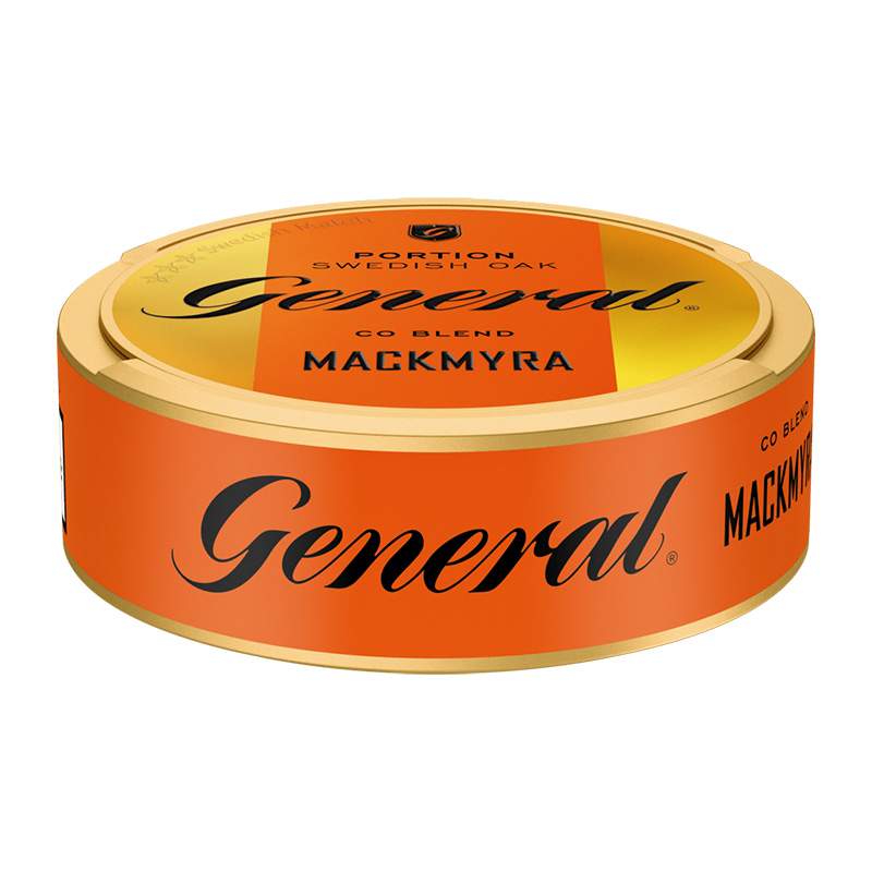 General Mackmyra Portion från tillverkaren Swedish Match är ett Portionssnus som innehåller Mackmyra Whiskey. Snuset har en mörk tobakskaraktär med inslag av torkad frukt, ceder och whisky, samt aningen tjära och malt. Formatet på prillorna är Large och snuset är fuktig på ytan för en snabb och kraftig smakrelease. Fukthalten är 49% och snuset har en hållbarhet på ca 4 månader.