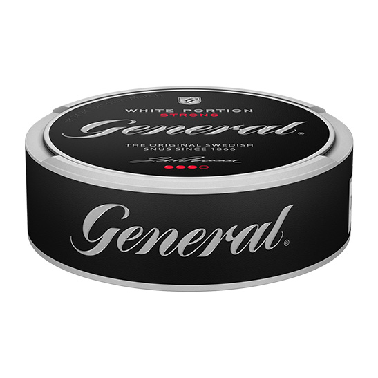 Snuset General White Strong har styrkan 3 Stark med sin nikotinhalt på 12 mg per prilla, eller omräknat till procent 1,3% nikotinhalt. Dosan innehåller 24 st prillor där varje prilla väger 0,9 gram vilket ger en total snusvikt på 21 gram per dosa. Hållbarheten är ca 4 månader.