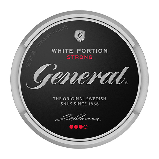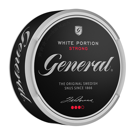 General White Strong från tillverkaren Swedish Match är ett snus av typen White Portionssnus. Snuset har en kryddig tobakskaraktär och med smakinslag av bergamott, samt aningen te, hö och läder. En till formatet stor White Portionssnus prilla som är torr på ytan och med ett fuktigt innehåll. Ger en låg rinnighet och en varaktig smakrelease.