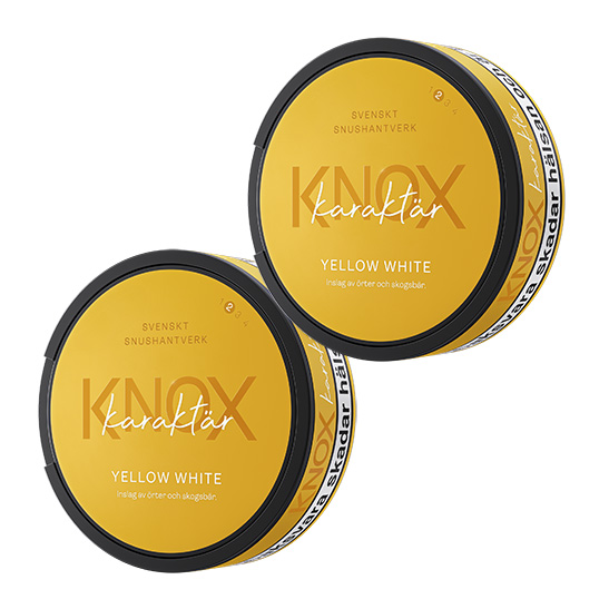 Knox Karaktär Yellow White 2 pack är ett snus från Skruf Snus vilken har smakkombination av örter och skogsbär med en tydlig tobakskaraktär. Snuset ger dig en riklig frisättning av smak vilken kompletteras av en medelstark nikotinkick. Prillorna har formatet Large och tillhör typen White Portionssnus.