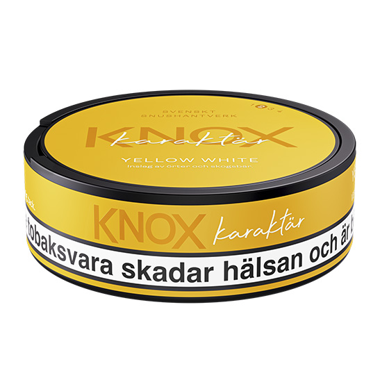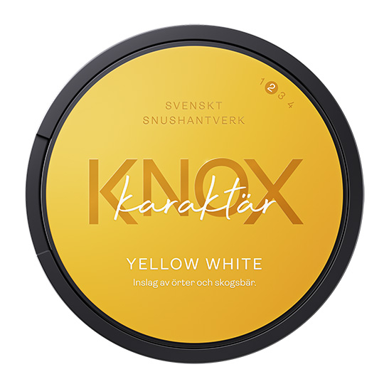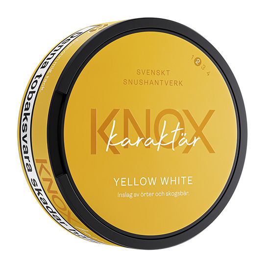 Knox Karaktär Yellow White är ett snus från Skruf Snus vilken har smakkombination av örter och skogsbär med en tydlig tobakskaraktär. Snuset ger dig en riklig frisättning av smak vilken kompletteras av en medelstark nikotinkick. Prillorna har formatet Large och tillhör typen White Portionssnus.