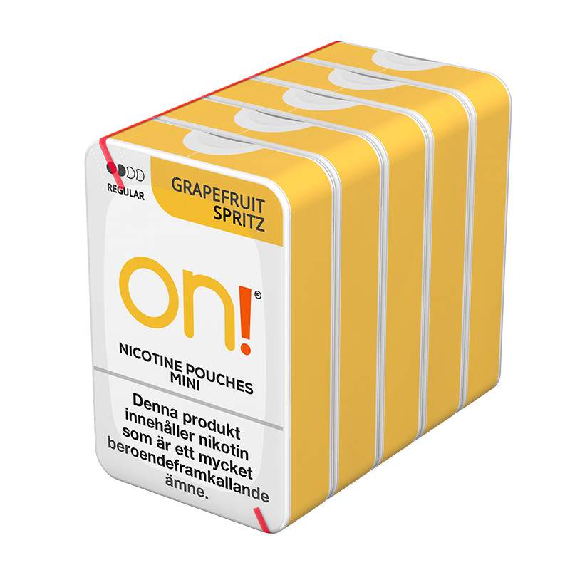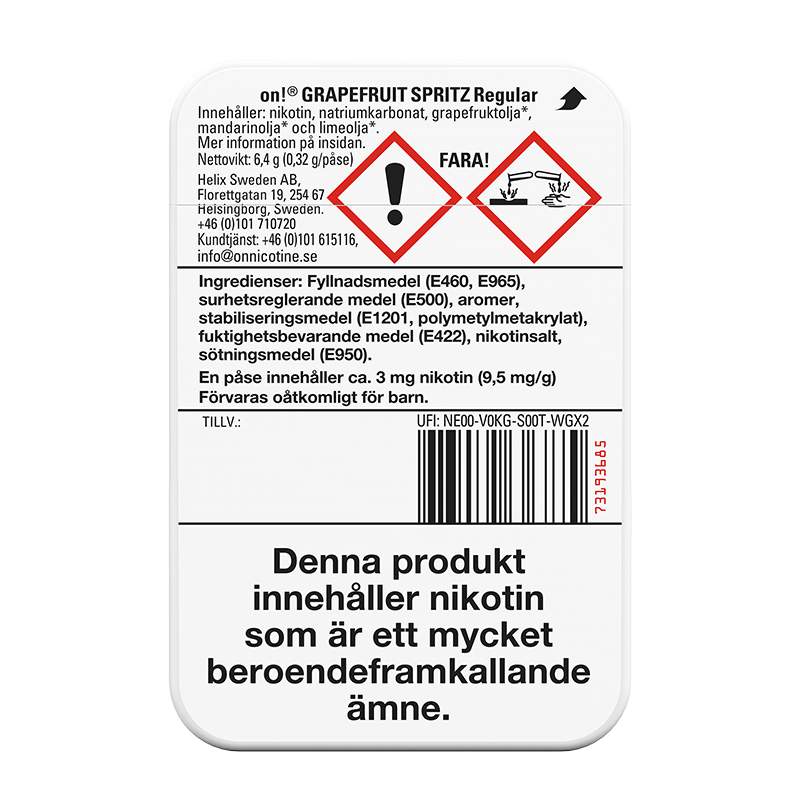 on! Grapefruit Spritz 3mg från tillverkaren Helix ett snus är av typen All White, eller nikotinpåsar och vitt snus som typen även kallas, en prilla helt utan tobak fast med nikotin. Prillan har formatet Mini som är en väldigt diskret mindre prilla vilken har en bra passform under läppen. Prillorna har en syrlig smak av grapefrukt i kombination med viss smak av vita vinbär. Hållbarheten på snuset är ca 18 månader.