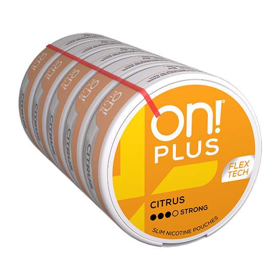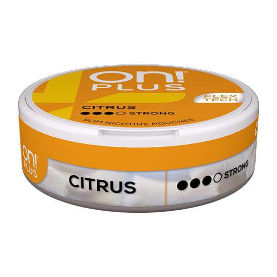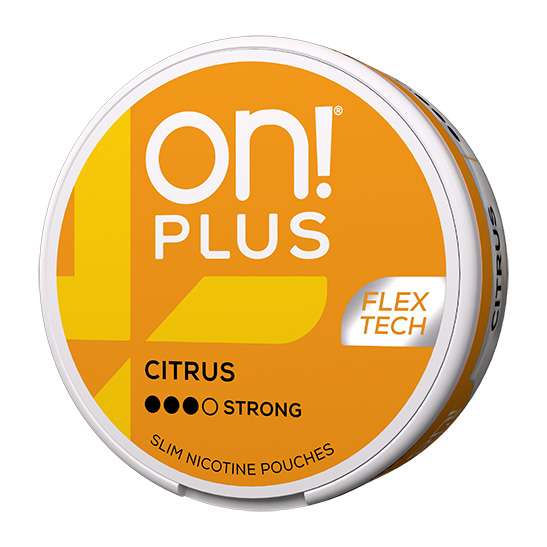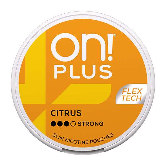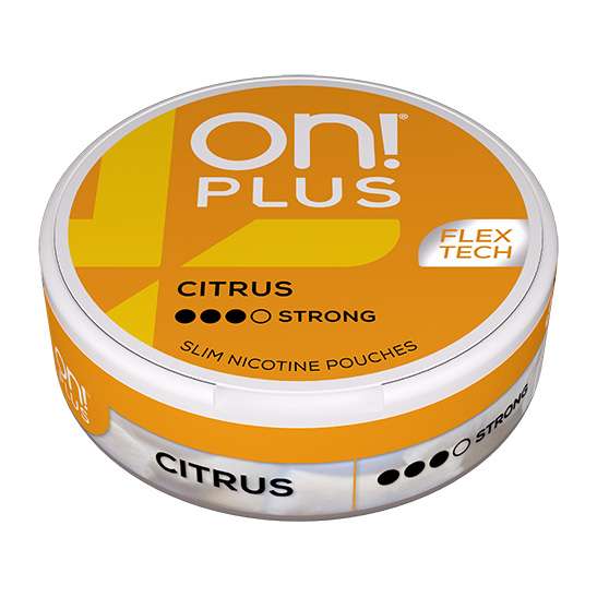 on! Plus Citrus Strong har styrkan 3 Stark med sitt nikotininnehåll på 1,3%. Varje prilla innehåller 9 mg nikotin. En snusdosa har 20 stycken prillor där varje prilla väger ca 0,7 gram, vilket ger en totalvikt snus i en snusdosa på 14,3 gram. Snusets hållbarhet är ca 18 månader och fukthalten är ca 10%.