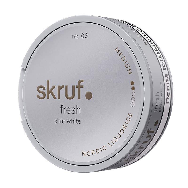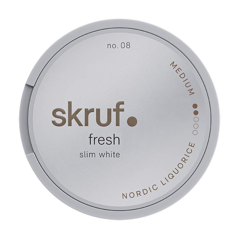 Skruf no 08 Fresh Nordic Liquorice är ett snus av typen White Portion vars prilla har formatet Slim. Prillan har en smak av lakrits och formatet Slim ger dig en långsmal prilla med bra passform under läppen. Hållbarheten på snuset är ca 6 månader.