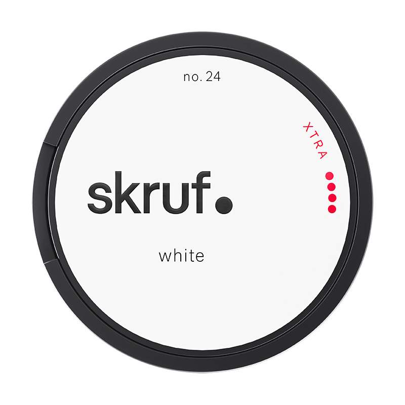 Skruf no 24 Xtra Stark White Portion är ett vitt extra starkt snus av typen White Portionssnus från tillverkaren Skruf Snus. Prillan har det större formatet Large och en mild smak av tobak med inslag av bergamott och rosenolja. Hållbarheten på snuset är ca 6 månader.