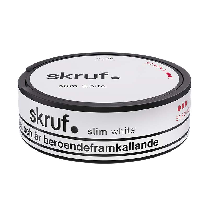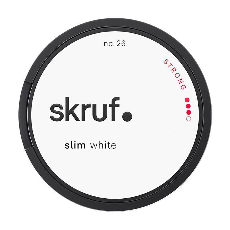 Skruf no 26 Slim Stark White Portion är ett snus av typen White Portionssnus där prillan innehåller tobak och har en klassisk tobakssmak. Snuset tillverkas av producenten Skruf Snus. Prillan är stark samt kommer i formatet Slim, vilket ger dig en långsmal prilla med bra passform under läppen. Hållbarheten på snuset är ca 6 månader.