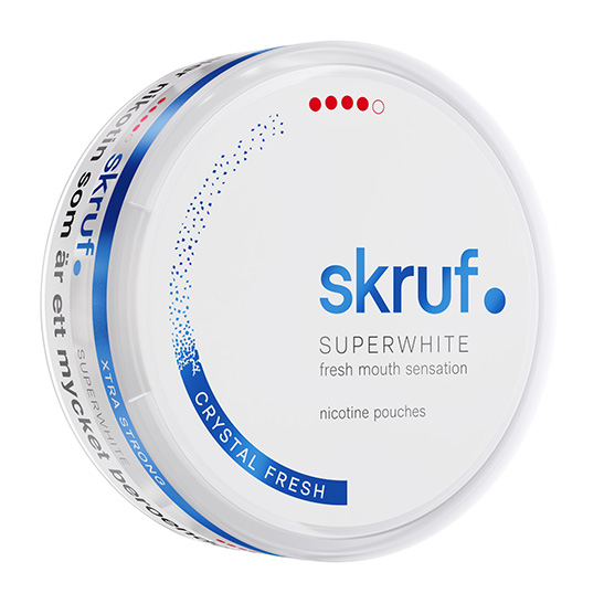 skruf SUPERWHITE Crystal Fresh Extra Strong är ett snus av typen Vitt Snus, eller nikotinpåsar och All White som typen även kallas, en prilla helt utan tobak fast med nikotin. Prillan har formatet Slim som är en diskret mindre prilla vilken har en bra passform under läppen. Prillan som kommer från tillverkaren Skruf Snus ger dig den uppfriskande känslan av eukalyptus och en kylande känsla av menthol, de innovativa blå kristallerna ger en fräsch munkänsla. Snuset har styrkan 4 Extra Stark och kommer från tillverkaren Skruf Snus.