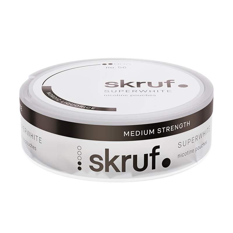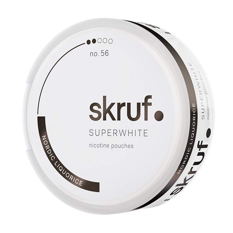 skruf SUPERWHITE no 56 Nordic Liquorice är ett snus av typen Vitt Snus i formatet Slim, en prilla helt utan tobak fast med nikotin. Snuset har en smak av lakrits. Snuset kommer från tillverkaren Skruf Snus. Eftersom prillan inte innehåller tobak så missfärgar den heller inte tänderna. Prillan innehåller inget sötnings- eller blekningsmedel, innehåller växtfiber som ger en mjuk känsla och sitter perfekt under läppen. Fukthalten på snuset är medium.