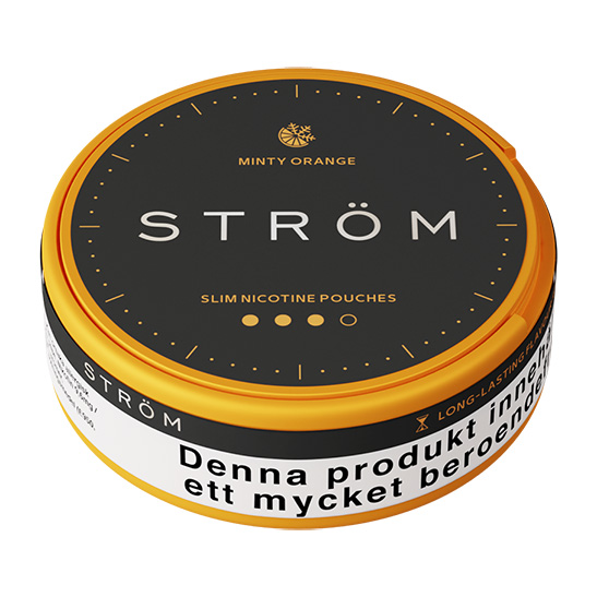 Det är 20 prillor per dosa i en STRÖM Minty Orange och varje portion väger 0,625 gram vilket ger en snusvikt per dosa på 12,5 gram. Nikotinstyrkan är 3 Stark med 9,6 mg nikotin per prilla, vilket ger en nikotinhalt på 1,5%. Hållbarheten är ca 12 månader.