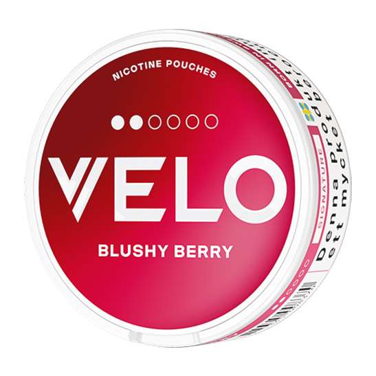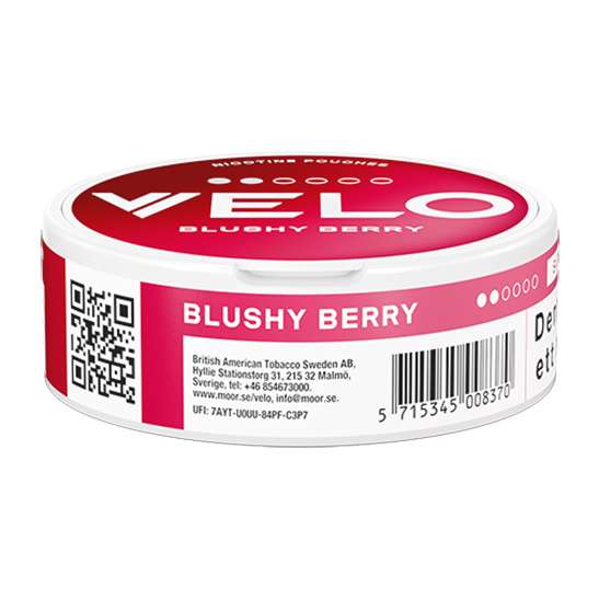 VELO Blushy Berry Slim (heter numera VELO Ruby Berry Slim) är ett snus av typen all white eller nikotinpåse som den även kallas. Ett snus helt utan tobak som kommer från tillverkaren British American Tobacco. Prillan har en smak av röda bär, samt toner av lite grönska och med en viss syrlighet. Formatet på prillan Slim och styrkan 2 Normal.
