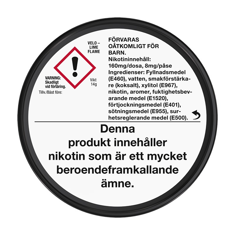 Snuset VELO Lime Flame Strong Slim har som det låter styrkan 3 Stark med sitt nikotininnehåll på 1,14%, eller omräknat per påse 8 mg nikotin. Varje prilla väger 0,7 gram och en snusdosa innehåller 20 stycken prillor, det ger en total snusvikt per snusdosa på 14 gram snus.