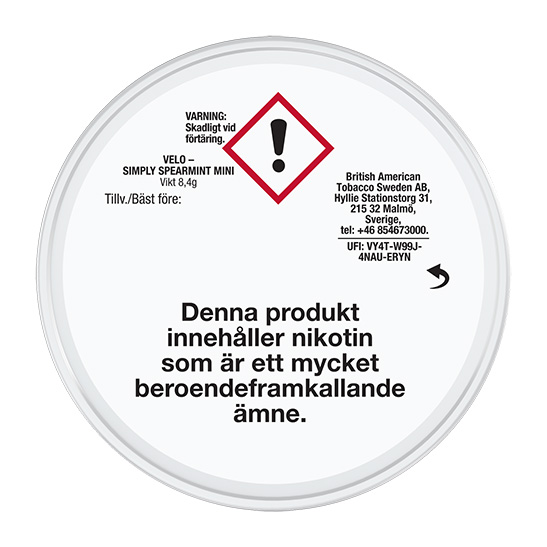Snuset VELO Simply Spearmint Mini har styrkan 1 Svag med sitt nikotininnehåll på 4 mg per påse. Det blir en nikotinhalt på 0,95%. Varje prilla väger 0,42 gram och det finns 20 stycken prillor i en snusdosa. Det ger en totalvikt med snus på 8,4 gram per snusdosa.