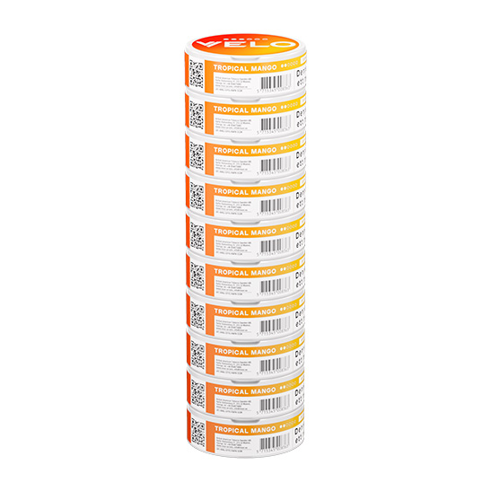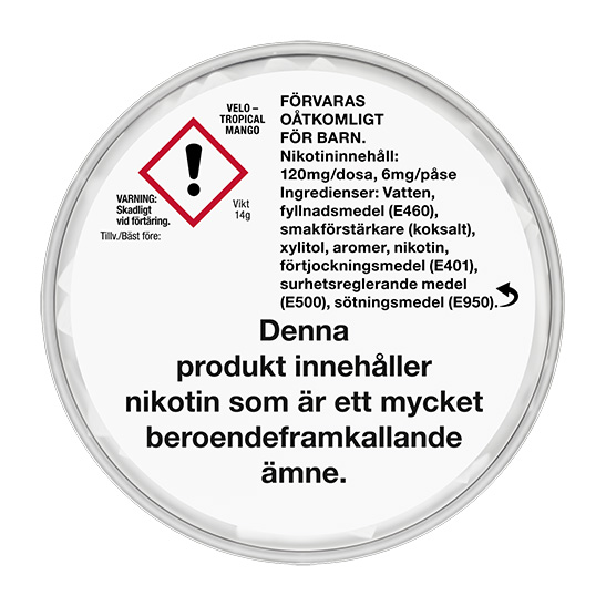 VELO Tropical Mango Slim innehåller; Vatten, fyllnadsmedel, smakförstärkare (koksalt), xylitol, nikotin, aromer, förtjockningsmedel, surhetsreglerande medel samt sötningsmedel.