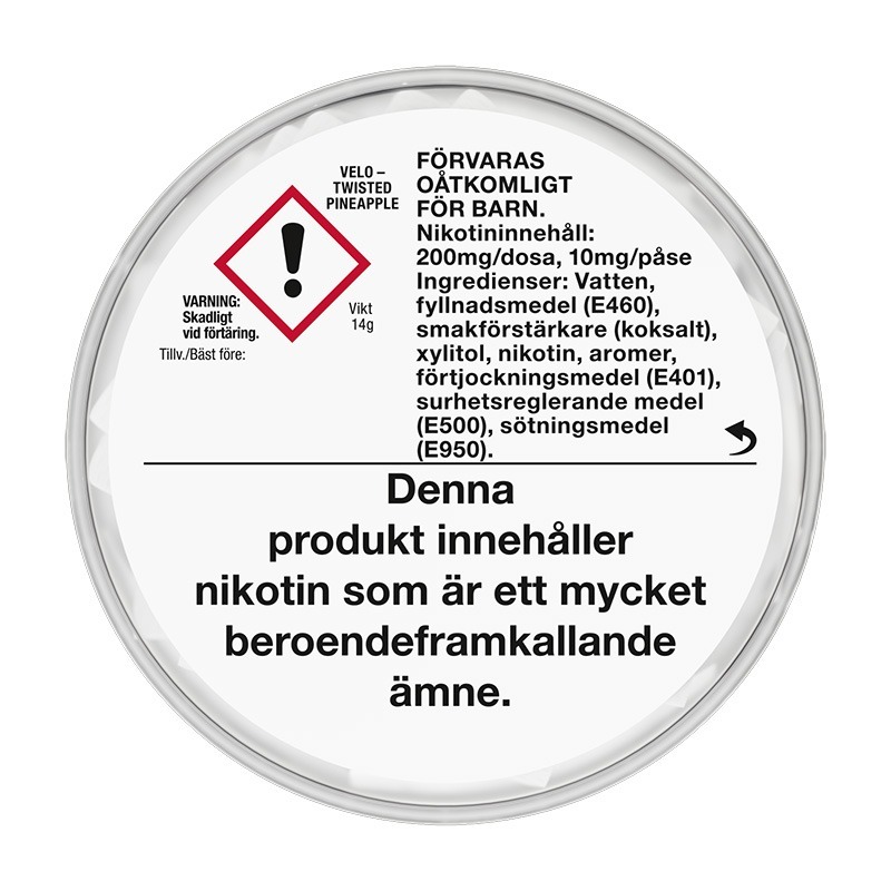 Styrkan i VELO Twisted Pineapple Slim är 3 Stark. Snuset innehåller 1,4% nikotin vilket per prilla blir 10 mg nikotin per påse. Varje dosa innehåller 20 st prillor där varje prilla väger 0,7 gram. Det ger en total snusvikt per snusdosa på totalt 14 gram snus.