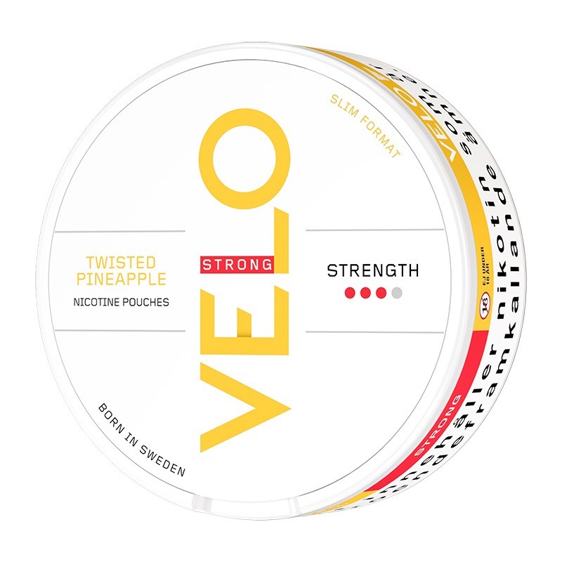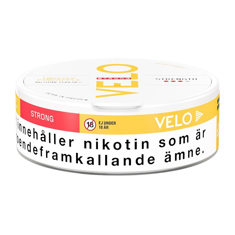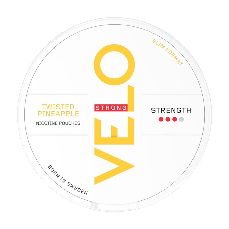 VELO Twisted Pineapple Slim är ett snus av typen All White eller nikotinpåsar som typen även kallas, ett snus helt utan tobak fast med nikotin. VELO kommer från tillverkaren British American Tobacco. Prillan ger dig en smak av piña colada i en stark portion. Formatet på prillorna är Slim, vilket är en mindre och diskret prilla som passar bra under läppen.