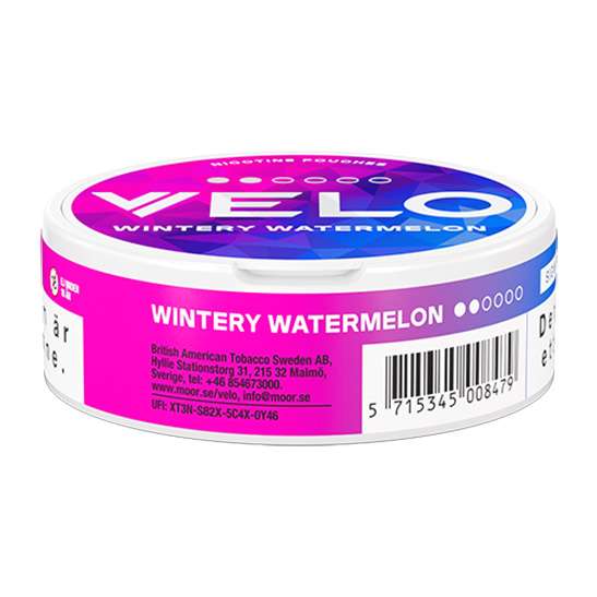 VELO Wintery Watermelon Mini är en tobaksfri nikotinpåse från tillverkaren British American Tobacco. Snuset är av typen All White, eller nikotinpåsar och vitt snus som typen även kallas, en prilla helt utan tobak fast med nikotin. Prillan har formatet Mini som är en mycket diskret mindre prilla vilken har en bra passform under läppen. Prillorna har en smak av vattenmelon och mynta. Hållbarheten på snuset är ca 12 månader. Fukthalten på snuset är 48%.