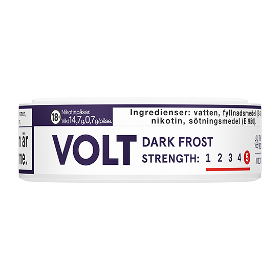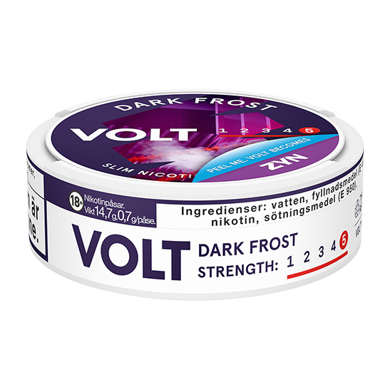 VOLT Dark Frost Super Strong är ett snus av typen All White eller nikotinpåsar som typen även kallas. Snuset VOLT tillverkas av producenten Swedish Match. Denna variant av VOLT är en mycket stark snus med en smak av mörka bär och frukter, toppade med mentol. En långsmal fuktig helvit prilla i formatet Slim. Fukthalten är på 48%.