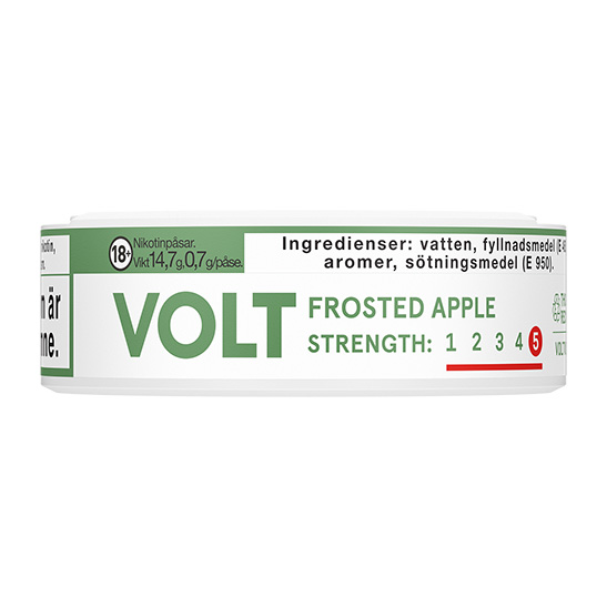 Snuset VOLT Frosted Apple Super Strong har styrkan 5 Super Stark där nikotinhalten är 1,55% vilket innebär att varje prilla innehåller 11 mg nikotin. En prilla väger 0,7 gram och i en snusdosa finns det 21 stycken påsar, vilket ger en total snusvikt på total 14,7 gram snus.