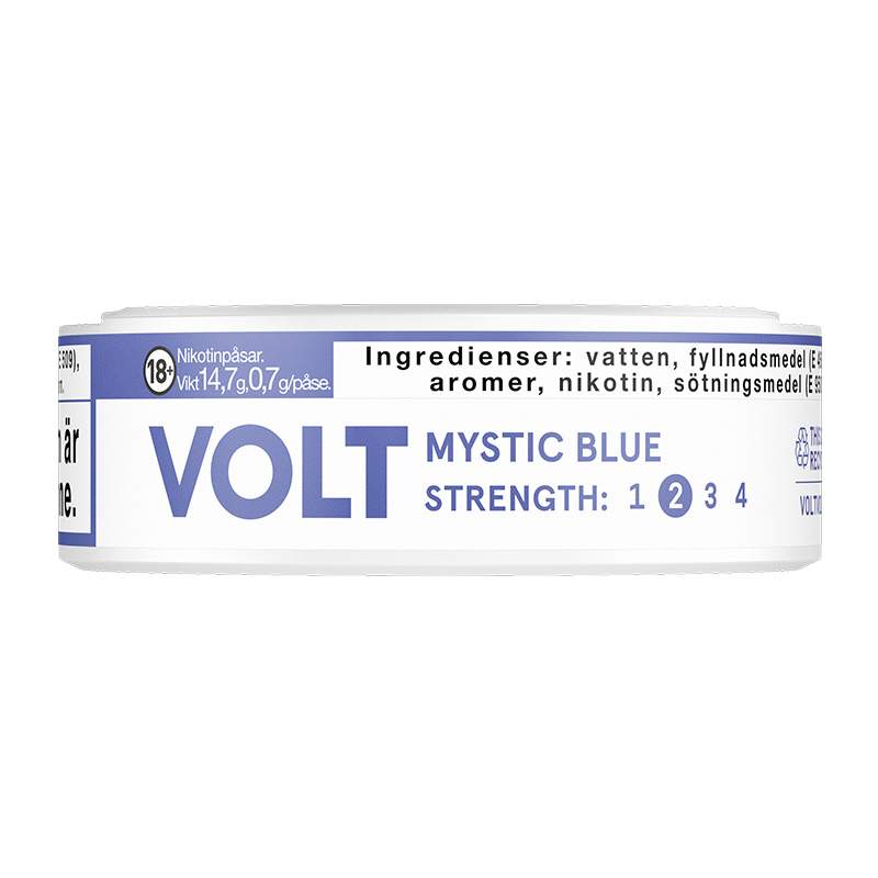 Snuset VOLT Mystic Blue Slim har styrkan 2 Normal. Prillan innehåller 0,93% nikotin där varje prilla innehåller 6,5 mg nikotin per påse. Varje prilla väger 0,7 gram och det är 21 stycken prillor i varje dosa, vilket ger en total snusvikt på 15 gram snus. Hållbarheten på snuset är ca 12 månader.