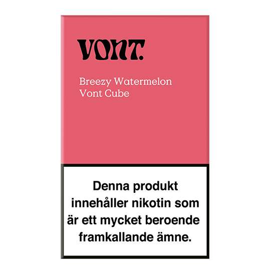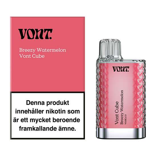 Vont Cube Breezy Watermelon 20mg är en vape med med 2 ml e-vätska. Den har en frisk smak av vattenmelon. Antal puffar är upp till 800 st beroende på användning. Nikotinstyrka ligger på 20mg/ml.