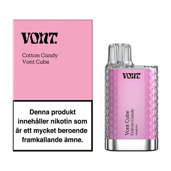 Vont Cube Cotton Candy 20mg är en vape med med 2 ml e-vätska. Den har en smak av sött socker och bär i en luftig konsistens. Antal puffar är upp till 800 st beroende på användning. Nikotinstyrka ligger på 20mg/ml.