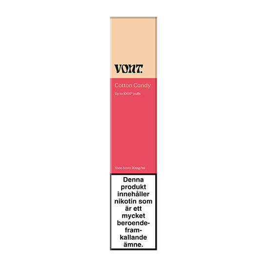 Vont Nova Cotton Candy 20mg är en färdigförpackad engångsvape med Mesh coil som inte kräver laddning eller påfyllning. Produkten är färdig att användas direkt, inhalera bara på munstycket så aktiveras din vape. Vont Nova är den tredje varianten i Vonts vape-familj. Sedan tidigare finns Vont To-Go och Vont Cube. Den avlånga formen på Vont Nova bidrar till att skapa ett jämnare och bättre air-flow, vilket resulterar i en behagligare vaping upplevelse. Med en förbättrad uppvärmningsteknologi ger Vont Nova en extra intensiv smakupplevelse och ger upp till 1000 puffar per enhet.