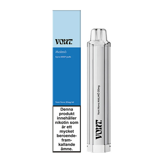 Vont Nova Malmö 20mg är en färdigförpackad engångsvape med Mesh coil som inte kräver laddning eller påfyllning. Produkten är färdig att användas direkt, inhalera bara på munstycket så aktiveras din vape. Vont Nova är den tredje varianten i Vonts vape-familj. Sedan tidigare finns Vont To-Go och Vont Cube. Den avlånga formen på Vont Nova bidrar till att skapa ett jämnare och bättre air-flow, vilket resulterar i en behagligare vaping upplevelse. Med en förbättrad uppvärmningsteknologi ger Vont Nova en extra intensiv smakupplevelse och ger upp till 1000 puffar per enhet.