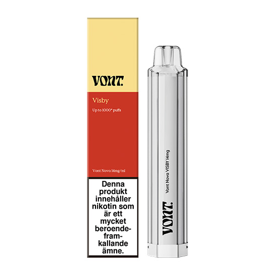 Vont Nova Visby 14mg är en färdigförpackad engångsvape med Mesh coil som inte kräver laddning eller påfyllning. Produkten är färdig att användas direkt, inhalera bara på munstycket så aktiveras din vape. Vont Nova är den tredje varianten i Vonts vape-familj. Sedan tidigare finns Vont To-Go och Vont Cube. Den avlånga formen på Vont Nova bidrar till att skapa ett jämnare och bättre air-flow, vilket resulterar i en behagligare vaping upplevelse. Med en förbättrad uppvärmningsteknologi ger Vont Nova en extra intensiv smakupplevelse och ger upp till 1000 puffar per enhet.
