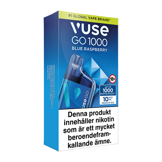Vuse GO Box 1000 Blue Raspberry 10mg från företaget British American Tobacco är en engångsvape som innehåller 10 mg/ml nikotin per enhet. Den har en smak av björnbär.