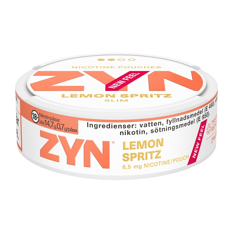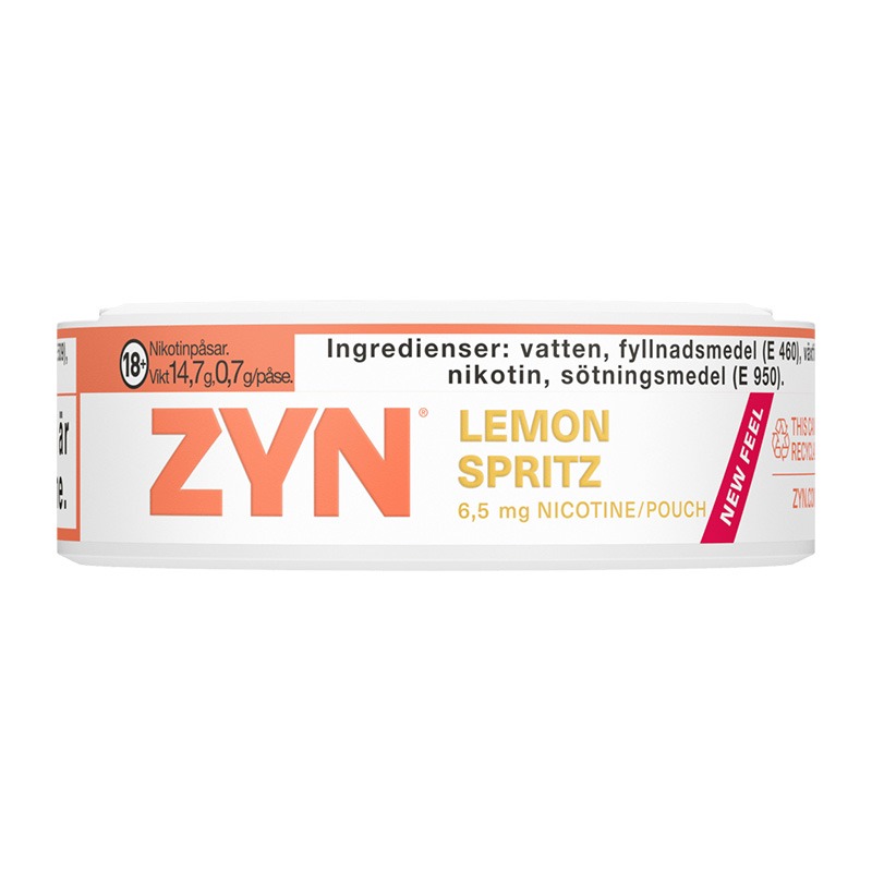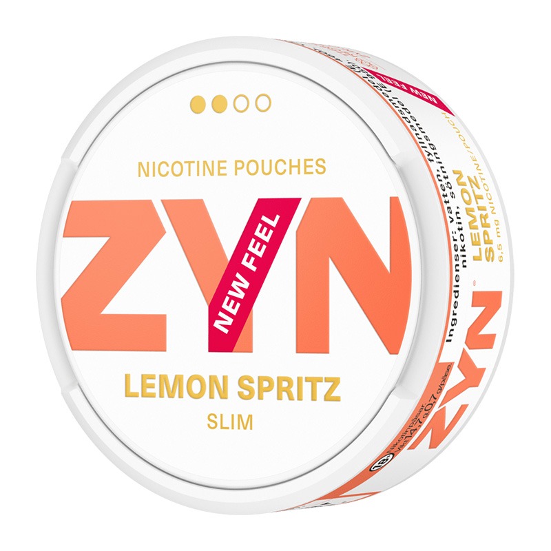 ZYN Lemon Spritz Slim ”New Feel” är ett snus från tillverkaren Swedish Match och är av typen All White, eller nikotinpåsar som sorten även kallas för. Den har en smak av citron, persika, grapefrukt och rosenvatten. Här i en ny variant med ”New Feel”. Formatet på prillorna är Slim vilket är en långsmal prilla som är torr på ytan fast med fuktigt innehåll för låg rinnighet. Fukthalten är 40,5%. Hållbarheten på snuset är 12 månader.