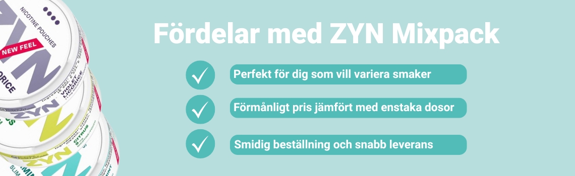 ZYN är ett modernt varumärke som ägs av Swedish Match, framtaget för dig som föredrar vitt snus. Hos MinPrilla.se hittar du hela ZYN sortimentet med olika varianter på nikotinstyrka, format och smaker. Utforska hela sortimentet och beställ dina favoriter med snabb leverans och fria fraktalternativ!
